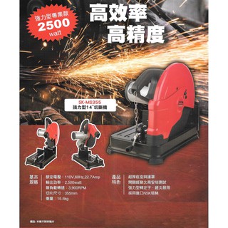 【如需統編結帳時請點選三聯發票】【商品規格】額定電壓:110V/60HZ功率:2500W無負載轉數:3900RPM切片尺寸:355mm重量:15.5KG【產品特色】1.超厚底、安全保護罩2.強力型定轉子,長久耐用3.進口NSK培林4.高效率、高精度